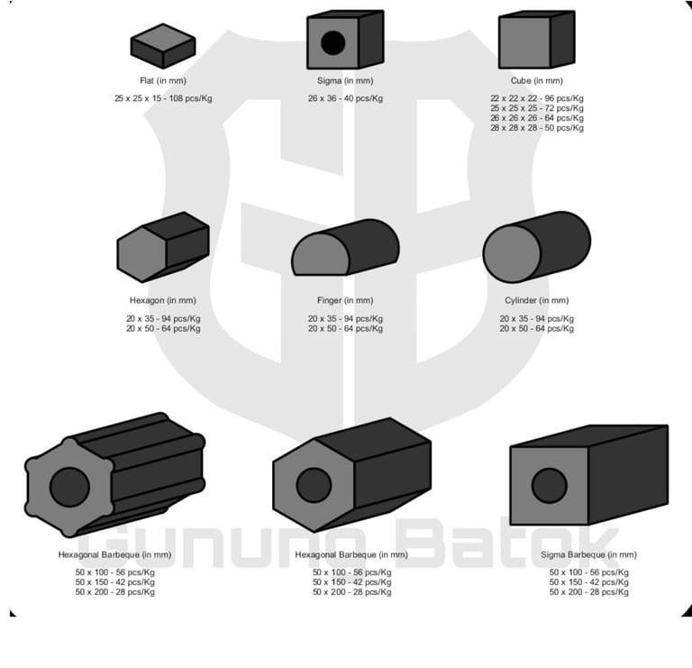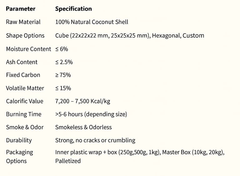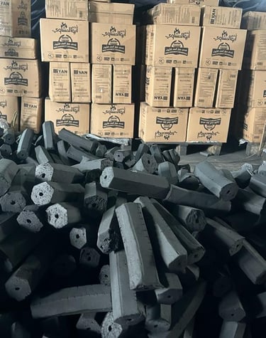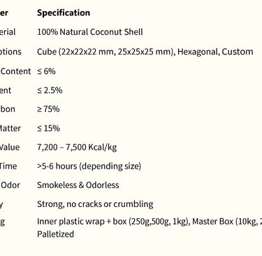 Manufacture coconut shell charcoal briquettes in cube and hexagonal shapes, tailored for hookah/shisha and barbecue use.